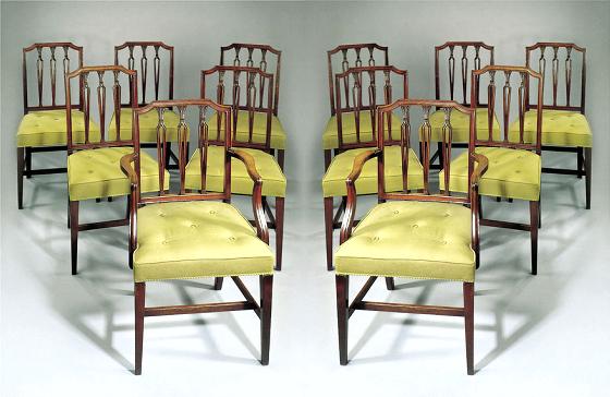 A fine set of twelve George III Hepplewhite design mahogany dining chairs comprising ten singles and two carvers, each with moulded top rails and uprights with carved leaf decoration, standing on tapering square section legs united by stretchers.