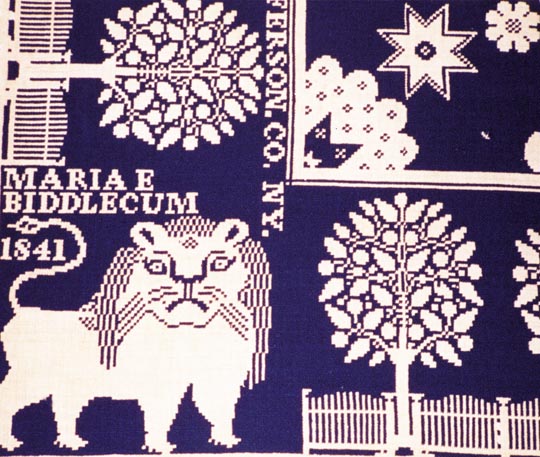 Pictured Detail: Corner of a figured coverlet woven by Harry Tyler, Jefferson County, New York, in 1841, for Maria E. Biddlecum. Blue wool and natural cotton.