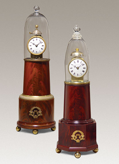 We are proud to offer each of these examples from this extraordinary reunion. Illustrated here are two exceptional Willard lighthouse clocks, Roxbury, Massachusetts, circa 1823-25. Although the options chosen for these two clocks were quite different, the cabinetmaker produced the cases in close sequence, if not consecutively. This is evidenced by the nearly identical veneers, each cut from the same choice mahogany flitch.