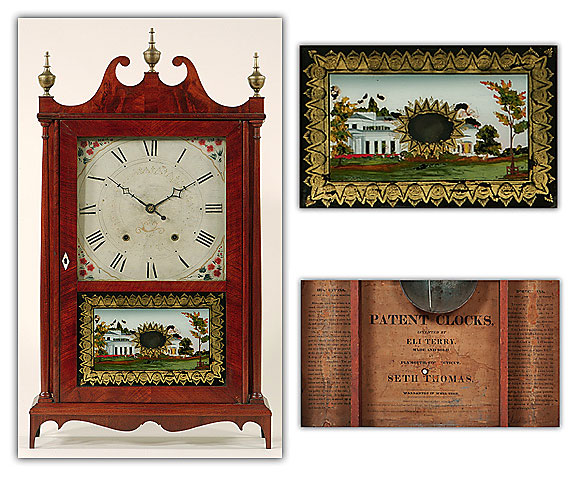 Fine Federal Mahogany Pillar and Scroll Shelf Clock labeled "Invented by ELI TERRY. Made and Sold at Plymouth, Connecticut by SETH THOMAS" having a broken arch top, brass finials, painted wooden dial, 30 hour wooden movement, original eglomise' painted glass, turned pillars flanking the door and a nicely shaped apron continuing to straight feet.