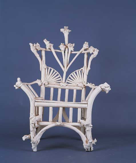 Chair constructed from birch root burls, with old white paint. From Maine or New Hampshire, circa 1910.