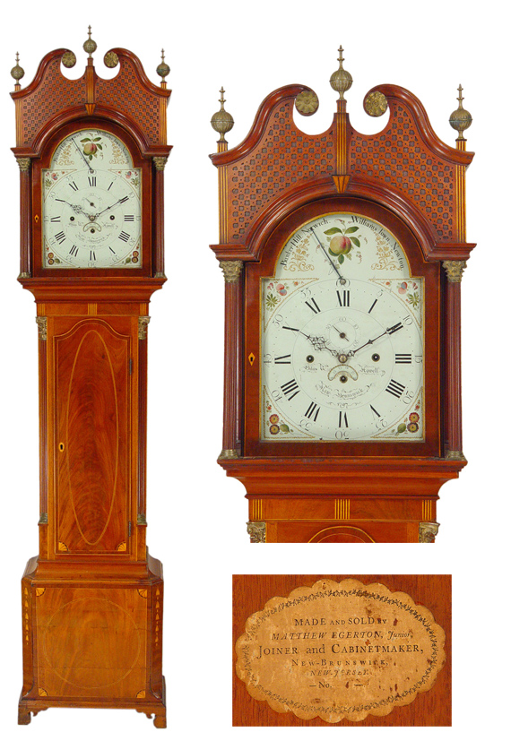An exceptional New Jersey musical tall clock. The case labeled by Matthew Egerton, Jr. and the dial signed by Silas W. Howell, New Brunswick, 1797. The brass eight day movement having a painted dial with a four song music selector. The fine Hepplewhite case is enhanced by the pierced blind fretwork in the upper bonnet. The lower case with inlaid stringing, features quarter fans and drop bellflower decorations.