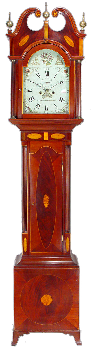 An exceptional tall case clock made by Aaron Brokaw, Bridgetown, New Jersey, circa 1800-10. The eight day brass movement with a painted dial having upper floral panel and calendar aperture. The elaborate Hepplewhite case with a broken arch cornice featuring inlaid pinwheels above oval panels. The lower case having a finely veneered door with oval fan and a lower panel with inlaid paterae. Height: 89 1/4" Width: 19 1/4".