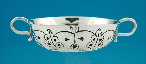 The shallow circular bowl with punched stylized flowers and sided by twin wire-work s-scroll handles, the interior centering a six petaled flower within a beaded roundel, the rim with contemporary scratched initials "H" over "IM", marked verso with rubbed maker's mark - possibly H