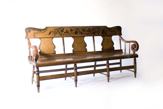 Settee with three wide splats, scrolled cherry arms, scrolled seat and eight turned legs. Grapevines and fruit at the crest. Probably Lancaster County, PA, circa 1830.