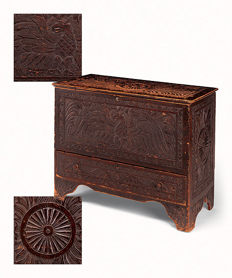 Eagle Chest Single drawer pin blanket chest, New England, fourth quarter of the 18th century. Robust, high relief patriotic eagle and sunflower decoration in the manner of a ship's carver, probably circa 1876. Ivory excutcheon. 20" x 42 1/2" x 34".