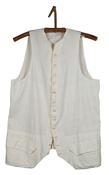 Corded muslin front with hand-woven linen back, excellent condition, retains all original covered buttons, 1780-1810, probably American.