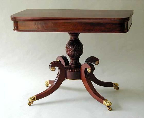 This fine mahogany games table features the use of gilt lacquered ornaments which are most often found on Boston furniture of this time. The rectilinear top with curved corners above a conforming apron is raised by a carved pedestal on four downward sweeping legs with lovely foliated-cast toecaps and casters.