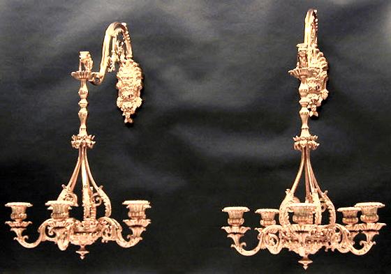 This splendid pair of hanging candle-powered sconces is quite rare. The brackets are adorned with classical masks and scrolling foliate-chased arms. The five-light pendants are delicately designed and beautifully executed.