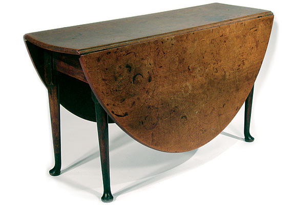 A great country Queen Anne table: maple, in original brown paint with the finest 'scrubbed' top. RI or eastern CT, c.1740-50. With a top measuring 52" x 59", this is one of only two tables this size that I have owned. In' as found' condition, with old home-made repairs to several joints. Sold by Roger Bacon in the 1970's, and in one collection since that time. Such a combination of size and surface rarely appears on the market.