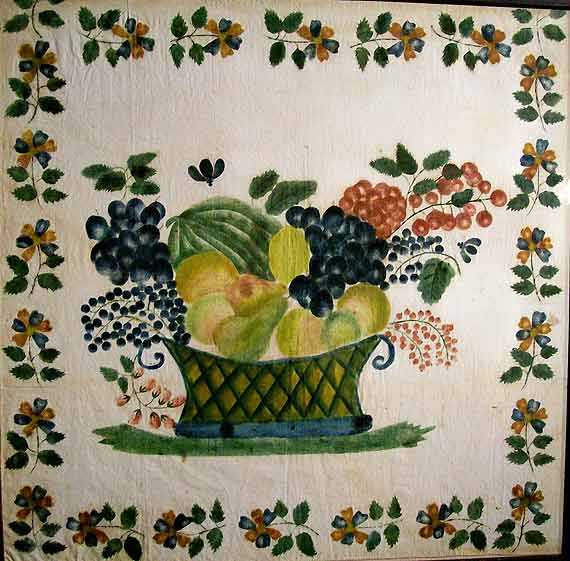Home | Dealers | Jewett-Berdan Antiques | Theorem Table Cover on Linen, circa 1830, Maine
