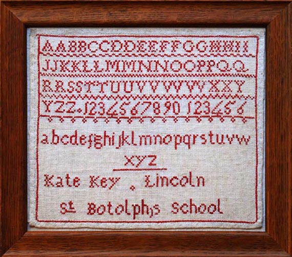 Kate Key practiced her alphabets in her marking sampler worked at St. Botolph's School, and the style of the sampler places it circa 1840. The red silk on crisp white linen is quite handsome and effective. One can assume that from its simplicity this might have been Kate's very first sampler made at a young age.