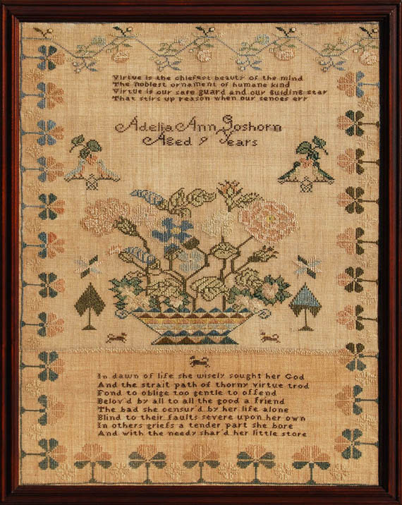 Adelia Ann was the eldest of their 7 children. She worked this large, handsome sampler when she was 9 years old, circa 1833. It is formed of two pieces of linen which were joined by a seam, much of which was then covered by needlework, directly under the large basket. A strong and somewhat stylized arrangement of flowers within this sawtooth-decorated basket dominates the composition of this sampler, with little dogs, pine trees, stars and pairs of birds providing further embellishment. The verse is one that was used by samplermakers by American samplermakers throughout the 18th and early 19th century, extolling Virtue as a "guiding star." Ohio samplers have been wonderfully and thoroughly researched by the late Sue Studebaker, however no sampler that resembles Adelia Ann's has been recorded.