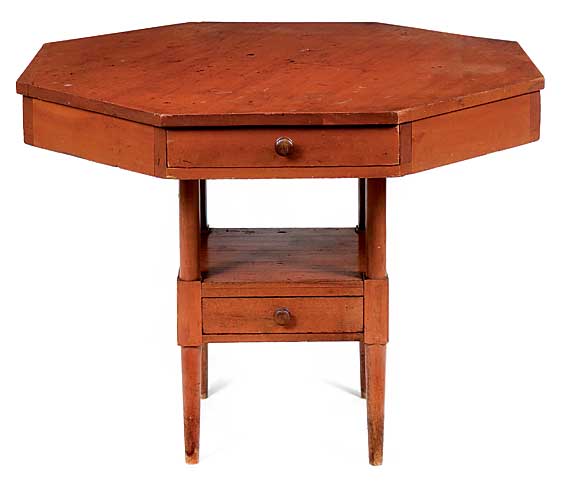 Unique octagonal-top Shaker work table with five drawers in original bittersweet paint. Enfield, NH, mid-19th century. 38-1/2" x 38-1/4" x 30-1/4" H