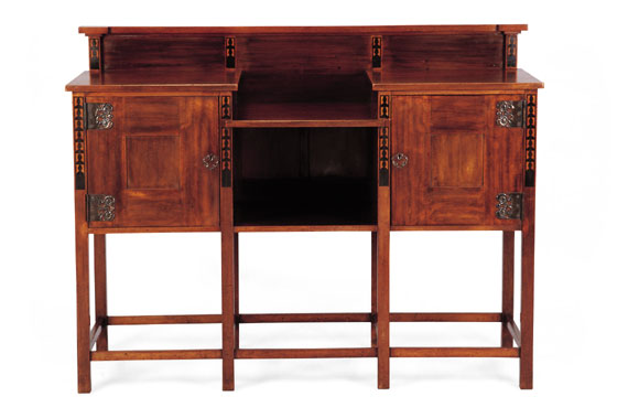 Designed by Frank Brangwyn for The Billiard Room, Horton House; executed by E. Pollard & Co. Ltd., circa 1916. Mahogany inlaid with ebony and mahogany and oxidized brass hardware. Illustrated in The Decorative Art of Frank Brangwyn by Herbert Furst, 1924.