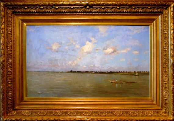 Alexandre Marcette's painting "Bringing in the Net" describes fishermen in a small boat off the shore as they draw in their net. Although the subject of men fishing seems commonplace, the grand scale of Marcette's painting lends this scene a dramatic quality. The cool blue ocean and cloud-filled sky are so vast in scale that they overwhelm the landscape, the fishermen, and the sailing vessels that populate the water.