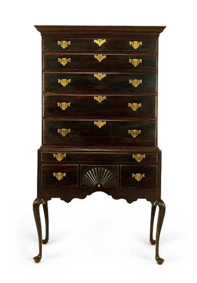 Having a bold cornice, fan-carved drawer in lower case, rhythmically scrolled apron and sweeping cabriole legs terminating in pad feet; hard pine secondaries and design elements indicate a South Shore of Massachusetts origin; red and black grain paint is from the first half of the 19th century.