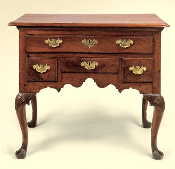 Having a molded top with invected corners and a rhythmically scrolled apron, shell-carved knees, and carved stocking feet. Walnut, with yellow poplar drawer blades and white cedar drawer bottoms.